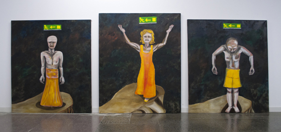 In die Triologie der Gesten (2014) besteht der Raum lediglich aus einem Felsvorsprung vor schwarzem Hintergrund. Auf diesem steht jeweils eine Person und vollführt eine Geste: entweder presst sie die Arme an den Körper, hebt die Arme in den Himmel oder formt einen Halbkreis. Obwohl diese Gesten raumgreifend sind, haftet den Figuren nichts Heroisches an. Ihre Gesichtszüge wirken gequält, ihre Proportionen sind dis-harmonisch. Statt mit der Natur verbunden zu sein, wie man es von anderen symbolistischen Malern wie Ferdinand Hodler kennt, stehen sie am Abgrund zum Nichts. Einzig ein Notausgangschild leuchtet in grün und gelb über den Figuren. Eine paradoxe Aussage: Gibt es hier tatsächlich einen Ausweg? Oder soll damit die Ausweglosigkeit der Situation noch betont werden?